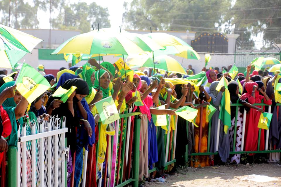 Taageerayaasha xisbiga KULMIYE ee gobolka Maroodi-jeex oo kusoo labistay astaanta uu xisbiga KULMIYE caanka ku yahay, isla markaana lulaya caleemo qoyan, wejiyadooda iyo shirkoodana kusoo xardhay calanka xisbiga KULMIYE, ayaa si waafi ah u muujiyey sida ay ula dhacsan yihiin taageerada KULMIYE iyo murrashaxiintiisa.