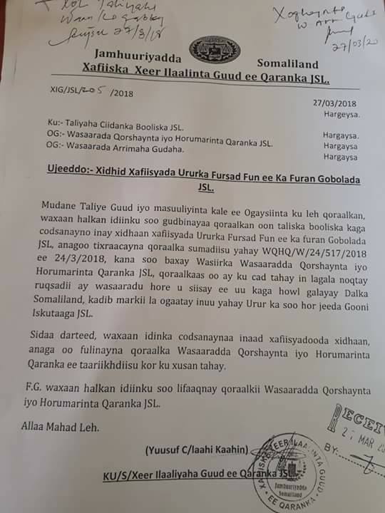 Xeer ilaaliyaha guud ee Somaliland ayaa amarro adag dul dhigay xafiiska ururka Fursad Fund uu ku leeyahay somaliland
