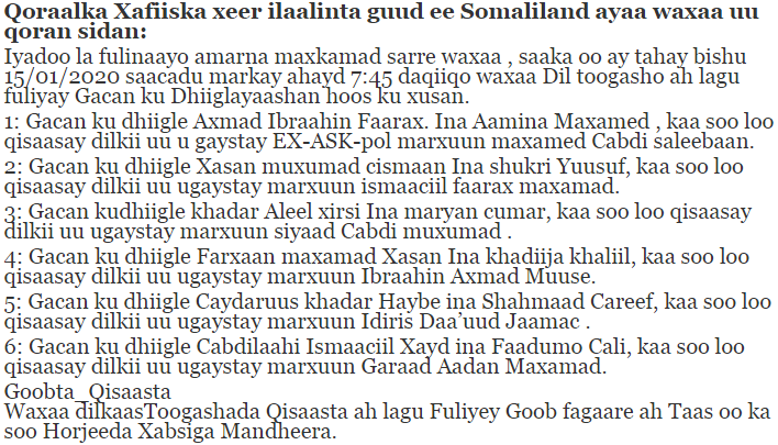 Xeer Ilaalinta Soomaaliland, ayaa soo saartay qoraal ay ku faahfaahinayso magacyada gacankudhiigleyaasha la toogtay iyo mid kastaa ba marxuumkii uu dilay. Waa na kan qoraalkaasi: