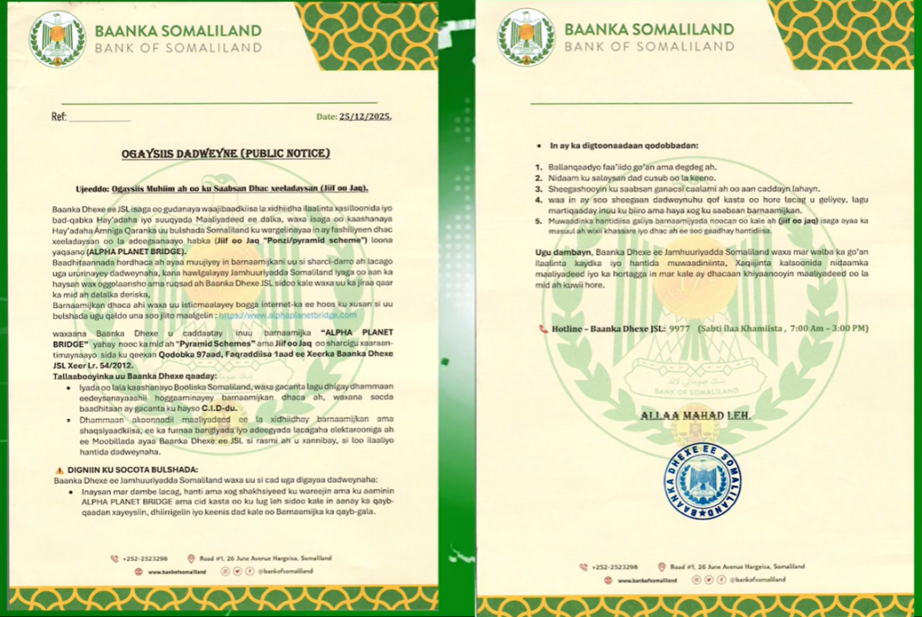 Baanka Dhexe ee Jamhuuriyadda Somaliland, ayaa digniin u diray bulshada in ay ka feejignaadaan nidaam ay sheegeen in uu yahay mid xeeladaysan (jiif oo jaq sh), oo lagu khiyaameeyo dadka, isla markaa na lacagaha lagaga dhacayo.