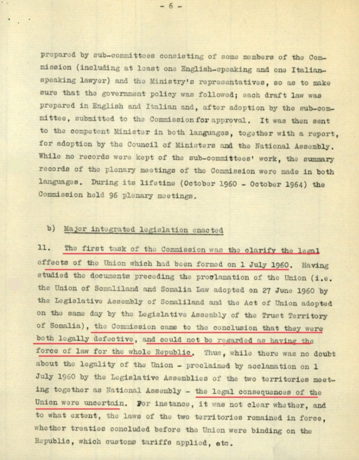 Warbixin rasmi ah oo ka soo baxday guddigii Qaramada Midoobay ee Isku-dhafka Sharciyada, ayaa sheegtay in hawshii ugu horreysay ee guddigu ahayd in la caddeeyo saamaynta sharci ee Midowgii Somaliland iyo Soomaaliya ee dhacay 1-dii Luulyo 1960.