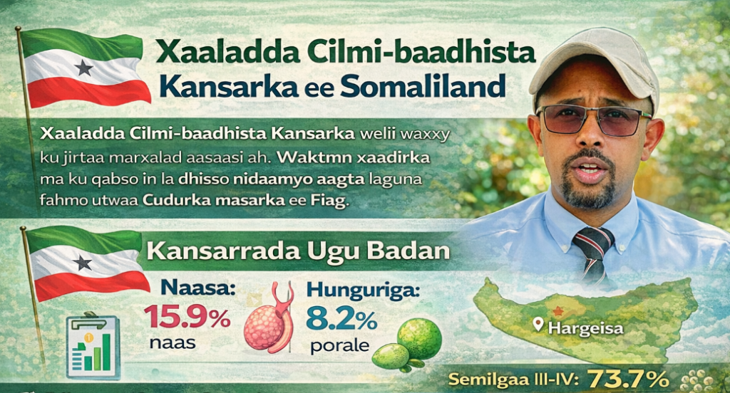 Xaaladda Cilmibaadhista Kansarka ee Somaliland: Baahiyaha Degdegga ah iyo Jihada Mustaqbalka 1. HORDHAC Cilmibaadhista kansarka ee Somaliland weli waxay ku jirtaa marxalad aasaasi ah. Waxaa jirta baahi weyn oo loo qabo in la dhiso nidaamyo rasmi ah oo lagu ururiyo xog caafimaad, la na fahmo culayska dhabta ah ee kansarku ku leeyahay bulshada. Waqtigan xaadirka ah: Ma jiro Diiwaanka Qaranka ee Kansarka (National Cancer Registry) Ma na jiro Qorshaha Qaranka ee La-dagaallanka Kansarka (National Cancer Control Plan โ NCCP). Arrintani waxay ka dhigan tahay in aan si sax ah loo garanayn tirada iyo baaxadda kansarka ee dalka. 2. XARUNTA ONCOLOGY-GA EE UGU HORREYSAY Bishii Luulyo 2022, waxaa magaalada Hargeysa ka hirgashay xaruntii ugu horreysay ee keliya ee si gaar ah ugu adeegta bukaanada kansarka, taasoo ku taalla Needle Hospital. Xaruntani waxay bixisay xogtii ugu horreysay ee muujinaysa qaabka kansarku uga jiro Somaliland. 3. NATIIJOOYINKII XOGTA HORE Sannadkii ugu horreeyay, Needle Hospital waxa ay diiwaangelisay 232 bukaan. Xogtan ayaa muujisay arrimo muhiim ah oo mudan in cilmibaadhis degdeg ah lagu sameeyo. 3.1 Kansarrada Ugu Badan Kansarrada ugu badan ee la arkay waxay ahaayeen: Kansarka naasaha: 15.9% Kansarka hunguriga (esophageal cancer): 8.2% Kansarka qanjirka ragga (prostate cancer): 7.3% 3.2 Astaamaha Bukaanada Xogtu waxay sidoo kale muujisay: 73.7% bukaanada waxaa lagu ogaaday marxalad dambe (Stage III ama IV) Daโda dhexe ee bukaanada: 60 sano Haweenka ayaa ka yara badan ragga (saamiga 1.3:1) Daahitaanka ogaanshaha cudurka ayaa ah caqabadda ugu weyn ee hadda jirta. 4. MEELAHA MUDNAANTA U LEH CILMI-BAADHISTA Iyadoo la eegayo xaaladda hadda jirta, cilmi-baadhista kansarka ee Somaliland waa inay xoogga saartaa qodobadan muhiimka ah: 4.1 Cilmi-baarista Faafitaanka iyo Sababaha Kansarka Dhisidda Diiwaanka Qaranka ee Kansarka Tani waa mudnaanta koowaad si loo helo xog dhamaystiran oo ku saabsan: Tirada kiisaska kansarka Noocyada ugu badan Heerarka dhimashada iyo badbaadada Daraasad gaar ah oo ku saabsan Kansarka Hunguriga Kansarkan oo aad u badan wuxuu u baahan yahay baaritaan ku saabsan: Sababaha deegaanka Cuntooyinka iyo hab nololeedka Arrimo hidde-sideed ama kiimikooyin halis ah 4.2 Cilmi-baarista Nidaamka Caafimaadka iyo Ogaanshaha Hore Ogaanshaha Hore iyo Baaritaanka Bulshada Waxaa loo baahan yahay in la baaro: Maxaa keena in bukaanadu soo daahaan? Sidee loo hirgelin karaa barnaamijyo baaritaan oo jaban? Tusaale ahaan: Kansarka naasaha Kansarka afka ilmo-galeenka Horumarinta Palliative Care Maadaama bukaanadu inta badan yimaadaan marxalad dambe, waa muhiim in la dhiso adeegyo daryeel iyo nafis ah oo ku habboon dhaqanka bulshada. 4.3 Kor u Qaadidda Awoodda Baaritaanka iyo Daaweynta Helitaanka Qalabka Casriga ah (IHC) Somaliland kama jirto adeegyada Immunohistochemistry (IHC), taasoo xaddidaysa ogaanshaha saxda ah iyo daaweyn la beegsan karo. Radiotherapy Somaliland ma laha adeeg shucaac-daaweyn, bukaanaduna waxay ku qasban yihiin inay dibadda u safraan. Cilmi-baaris ayaa muhiim u ah sidii adeeggan gudaha loogu hirgelin lahaa. 5. TALOOYIN IYO JIHADA MUSTAQBALKA Si loo horumariyo cilmi-baarista kansarka iyo daryeelka bukaanada, waxaa lagama maarmaan ah: In la sameeyo Qorshaha Qaranka ee Kansarka (NCCP) In la tababaro shaqaalaha caafimaadka gudaha In la xoojiyo iskaashiga caalamiga ah In la dhiso nidaamyo xog ururin iyo cilmi-baaris joogto ah 6. GUNAANAD Cilmi-baarista kansarka ee Somaliland waa inay ka bilaabataa dhismaha kaabeyaasha aasaasiga ah ee lagu tirin karo kiisaska lana fahmi karo qaabka cudurku u faafayo. Heerka sare ee bukaanada soo daahaya wuxuu muujinayaa baahida degdegga ah ee: Ogaanshaha hore Daryeelka palliative care Horumarinta adeegyada daaweynta Haddii tallaabooyin nidaamsan la qaado, cilmi-baaristu waxay si weyn u hagaajin kartaa caafimaadka bulshada iyo natiijooyinka bukaanada kansarka qaba. Medical Health Education Somaliland. Muuqaalka: Dr. Ciise Cabi Jaamac ![]()