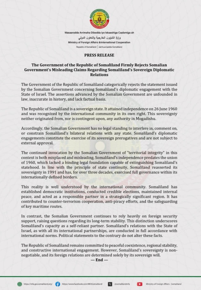 Warsaxaafadeed ka soo baxay Wasaaradda Arrimaha Dibadda iyo Iskaashiga Caalamiga ah ee Jamhuuriyadda Somaliland, ayaa si adag loogu dadafeeyey hadal ay soo saartay Dowladda Federaalka Soomaaliya oo ku saabsan xidhiidhka diblomaasiyadeed ee Somaliland la yeelanayso dowladda Israa’iil. Dowladda Somaliland waxay sheegtay in eedahaas ay yihiin kuwo aan sal sharci, taariikheed iyo xaqiiqo mid na lahayn.