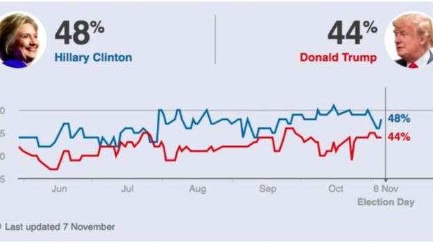 Donald Trump iyo Hillary Clinton ayaa wada saacadihii u dambeeyey isu soo baxyada ololahooda doorashada. Afkaarta dadka laga uruuriyey ayaa muujinaysa in Mrs Clinton ay ninka ay iska soo horjeedaan ee xisbiga Jamhuuriga ku hogaaminayso boqolkiiba 4 dhibcood.