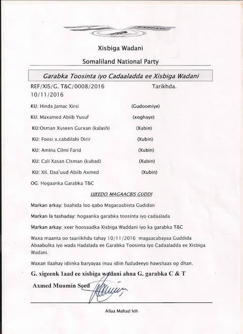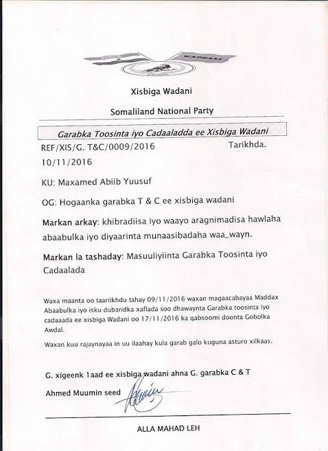 Warsaxaafadeedkan oo laga soo saaray xafiiska warfaafinta Garabka Toosinta Iyo Cadaalada Xisbiga WADDANI oo nuqul ka mid ahi la soo gaadhsiiyay Gacanlibaaxnews.Com xafiiska Hargeysa ayaa u qornaa Sidan:-