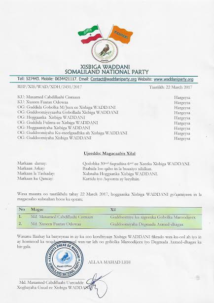 Xilalkan uu Xisbiga WADDANI u magacaabay mas’uuliyiinta, ayaa dhawaan mas’uuliyiin hore u hayey uu xisbigaasi ka caydhiyey xilalkaasi iyaga oo hore na u baahiyey digniino la xidhiidha gefaf ay ku sameeyeen shuruucda u taala Xisbiga WADDANI.